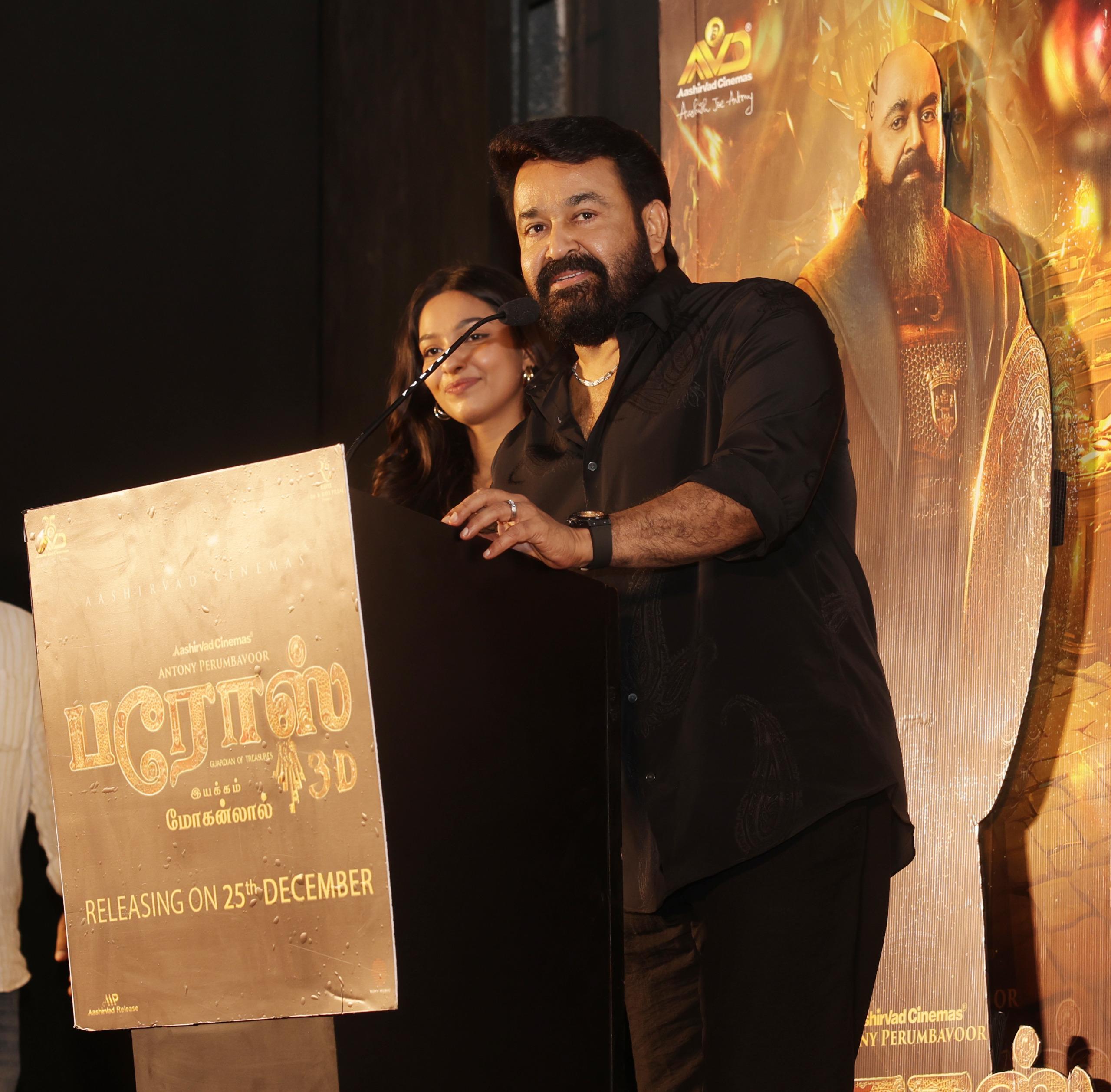 ஆசிர்வாத் சினிமாஸ் சார்பில், ஆண்டனி பெரும்பாவூர் தயாரிப்பில், மலையாள திரையுலகின் முன்னணி நட்சத்திர நடிகர் மோகன்லால் முதன்முறையாக இயக்கி நடித்திருக்கும், 3டி பிரம்மாண்ட ஃபேண்டஸி திரைப்படமான “பரோஸ்”, திரைப்படம் வரும் டிசம்பர் 25 ஆம் தேதி உலகமெங்கும் வெளியாகிறது. ரவிஸ் டாக்டர்.பி.ரவி பிள்ளை இப்படத்தை வழங்குகிறார். இப்படத்தின் முன் வெளியீட்டு நிகழ்வு படக்குழுவினர் கலந்துகொள்ள, கோலாகலமாக நடைபெற்றது.,