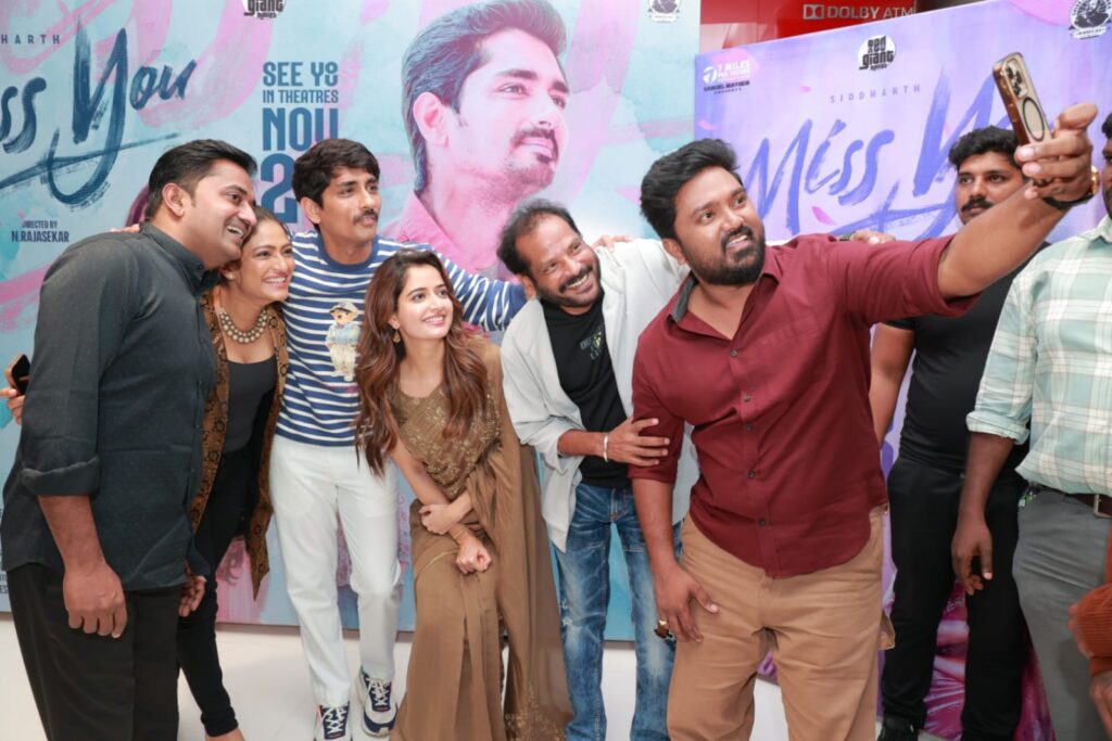 ‘மிஸ் யூ’ திரைப்படம் வரும் நவம்பர்- 29ல் திரையரங்குகளில் வெளியாகிறது. தமிழ் திரையுலகின் முன்னணி தயாரிப்பு நிறுவனமான ரெட் ஜெயண்ட் மூவிஸ் நிறுவனம் இப்படத்தைத் தமிழகமெங்கும் வெளியிடுகிறது. இப்படத்தின் ட்ரெய்லர் மற்றும் இசை வெளியீட்டு விழா சென்னை சத்யம் திரையரங்கில் நடைபெற்றது. இந்த நிகழ்வில் சிறப்பு விருந்தினராக கலந்துகொண்ட நடிகர் கார்த்தி இந்தப்படத்தின் ட்ரெய்லரை வெளியிட, நடிகர் சித்தார்த் அதை பெற்றுக்கொண்டார்.